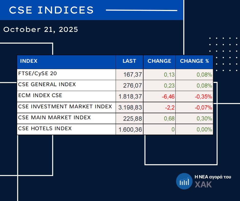 Η συνεδρίαση της 21.10.2025 στη Νεοαναπτυσσόμενη Αγορά του Χρηματιστηρίου Αξιών Κύπρου (ΧΑΚ) ολοκληρώθηκε με περιορισμένο ενδιαφέρον και ελάχιστη κινητικότητα, με μόνη εξαίρεση τη δραστηριότητα της GLOBALWEALTH GROUP PLC (ΓΟΥΕΛΘ(Σ)).