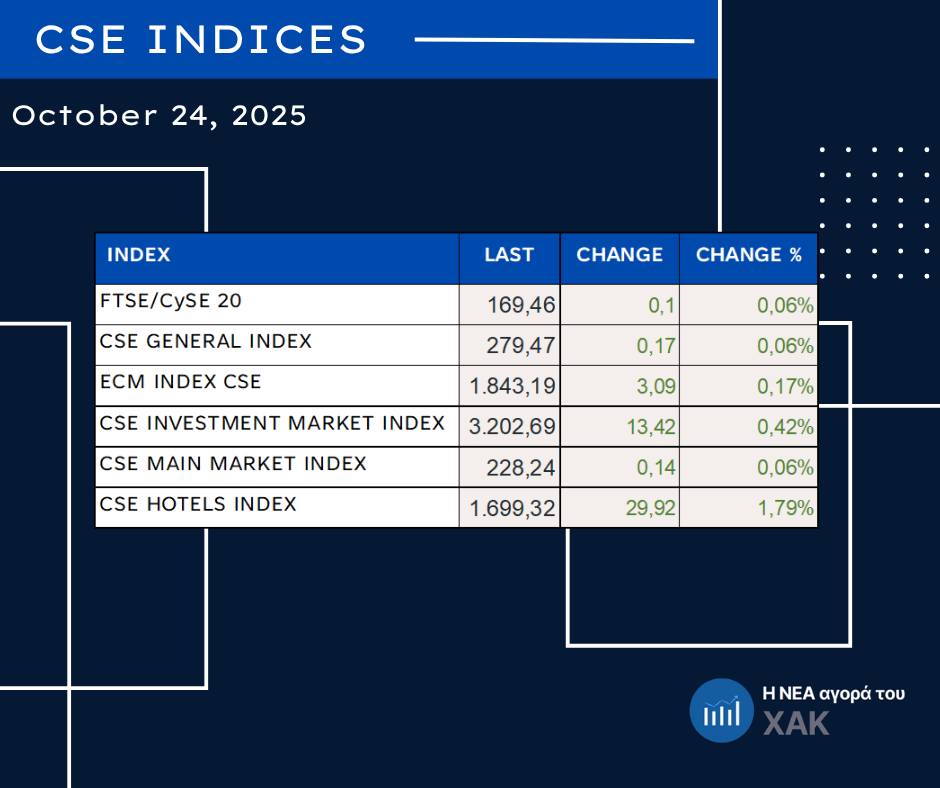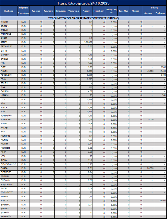 Η συνεδρίαση της 24.10. 2025 στη Νεοαναπτυσσόμενη Αγορά του ΧΑΚ ολοκληρώθηκε χωρίς καμία πράξη. Όλες οι εισηγμένες εταιρείες παρέμειναν αμετάβλητες. Στην πλευρά των εντολών το αγοραστικό ενδιαφέρον παρέμεινε σταθερό.