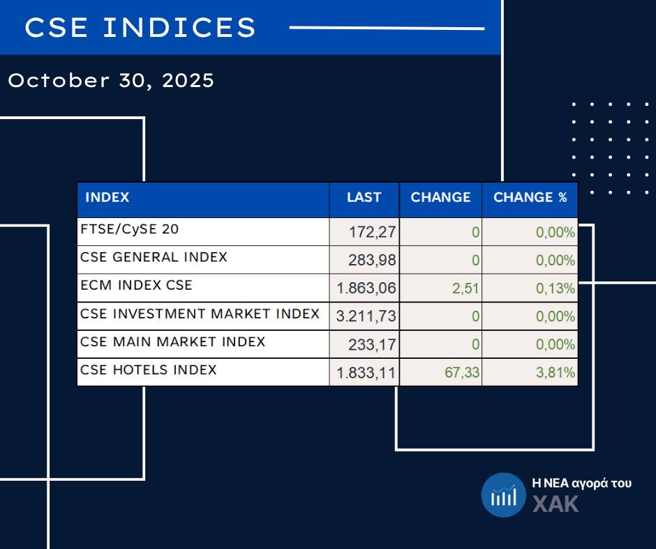 Η συνεδρίαση της 30.10.2025 στη Νεοαναπτυσσόμενη Αγορά του Χρηματιστηρίου Αξιών Κύπρου (ΧΑΚ) ολοκληρώθηκε με μία συναλλαγή, παρουσιάζοντας περιορισμένη κινητικότητα αλλά σταθερό ενδιαφέρον στις εντολές αγοράς και πώλησης.