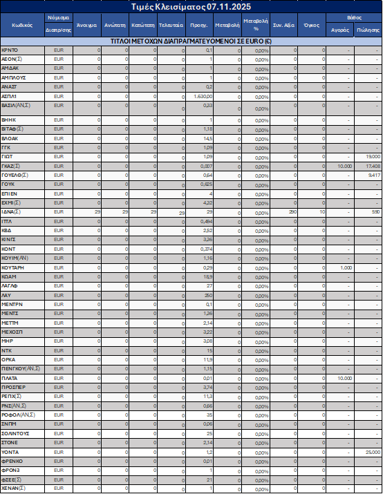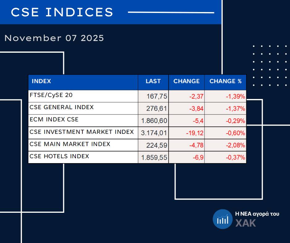 Η συνεδρίαση της 07.11.2025 στη Νεοαναπτυσσόμενη Αγορά του Χρηματιστηρίου Αξιών Κύπρου (ΧΑΚ) ολοκληρώθηκε με μία μόνο συναλλαγή, διατηρώντας ωστόσο το ήπιο κλίμα που χαρακτηρίζει την αγορά τις τελευταίες ημέρες.