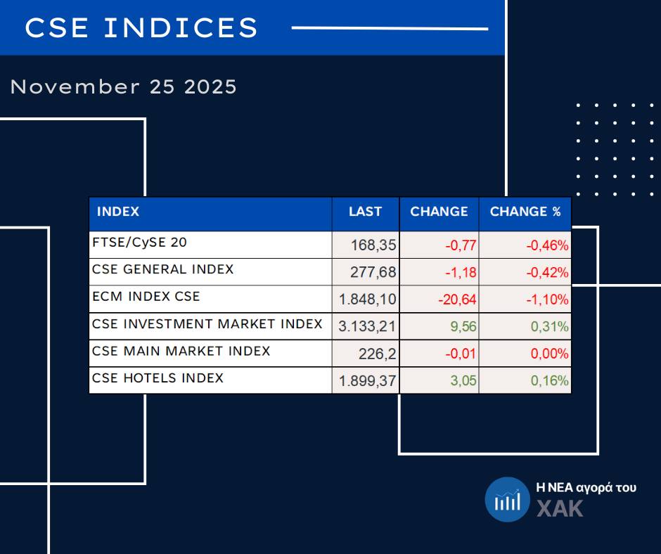 Η συνεδρίαση της 25ης Νοεμβρίου 2025 στη Νεοαναπτυσσόμενη Αγορά του Χρηματιστηρίου Αξιών Κύπρου (ΧΑΚ) ολοκληρώθηκε με ελάχιστη συναλλακτική δραστηριότητα. Παρόλα αυτά υπήρχε έντονο ενδιαφέρον με σημαντική παρουσία σε βάθος πώλησης και επιλεκτικές εντολές αγοράς.