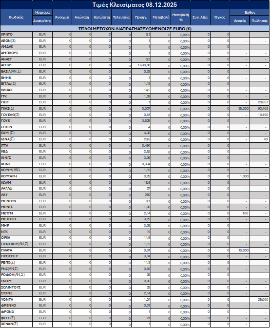 Η συνεδρίαση στη Νεοαναπτυσσόμενη Αγορά στις 08.12.2025 του Χρηματιστηρίου Αξιών Κύπρου ολοκληρώθηκε χωρίς την πραγματοποίηση συναλλαγών, αλλά με εντολές κυρίως στην πλευρά της προσφοράς.