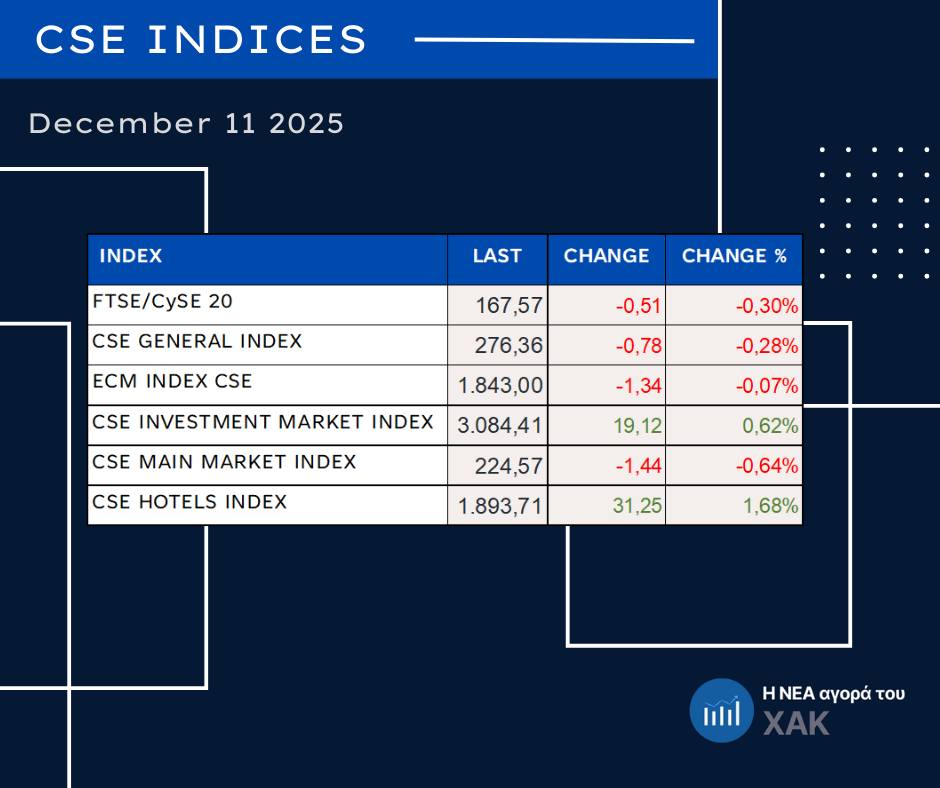 Η συνεδρίαση στη Νεοαναπτυσσόμενη Αγορά του Χρηματιστηρίου Αξιών Κύπρου στις 11.12.2025 ολοκληρώθηκε με περιορισμένη αλλά ουσιαστική συναλλακτική δραστηριότητα, με το ενδιαφέρον να εστιάζεται σε έναν μόνο τίτλο, ενώ οι εντολές παρέμειναν ενεργές κυρίως στην πλευρά της προσφοράς.
