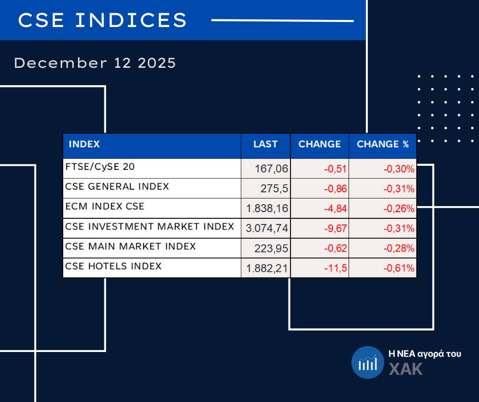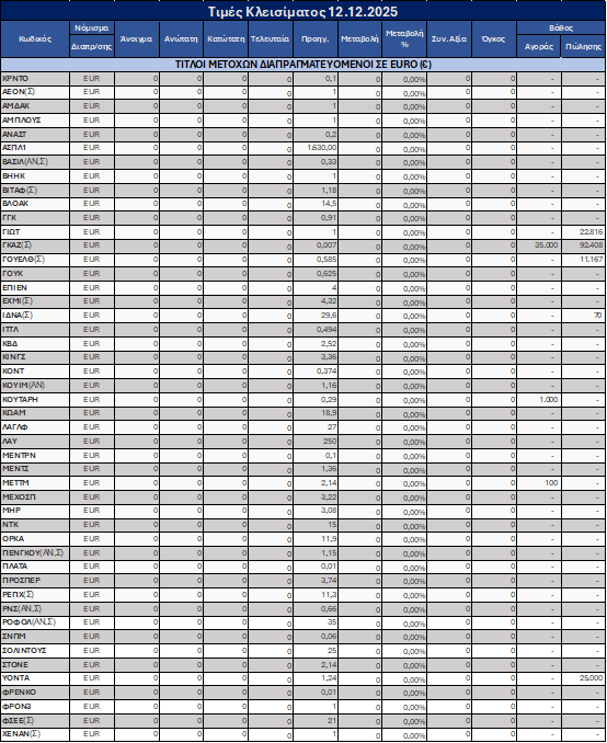Η συνεδρίαση στη Νεοαναπτυσσόμενη Αγορά του Χρηματιστηρίου Αξιών Κύπρου ολοκληρώθηκε χωρίς την πραγματοποίηση συναλλαγών στις 12.12.2025, με το ενδιαφέρον να περιορίζεται αποκλειστικά στις εντολές και τη δραστηριότητα να εντοπίζεται κυρίως στην πλευρά της προσφοράς.