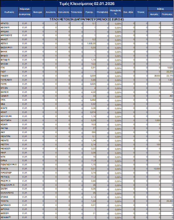 Όλοι οι τίτλοι που διαπραγματεύονται παρέμειναν αμετάβλητοι, με τις τιμές κλεισίματος να διαμορφώνονται στα ίδια επίπεδα με την προηγούμενη συνεδρίαση.